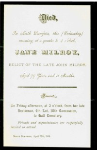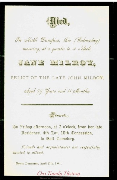 Jane McCarlie Milroy lived in North Dumfries, Waterloo, Ontario, Canada, in 1852.